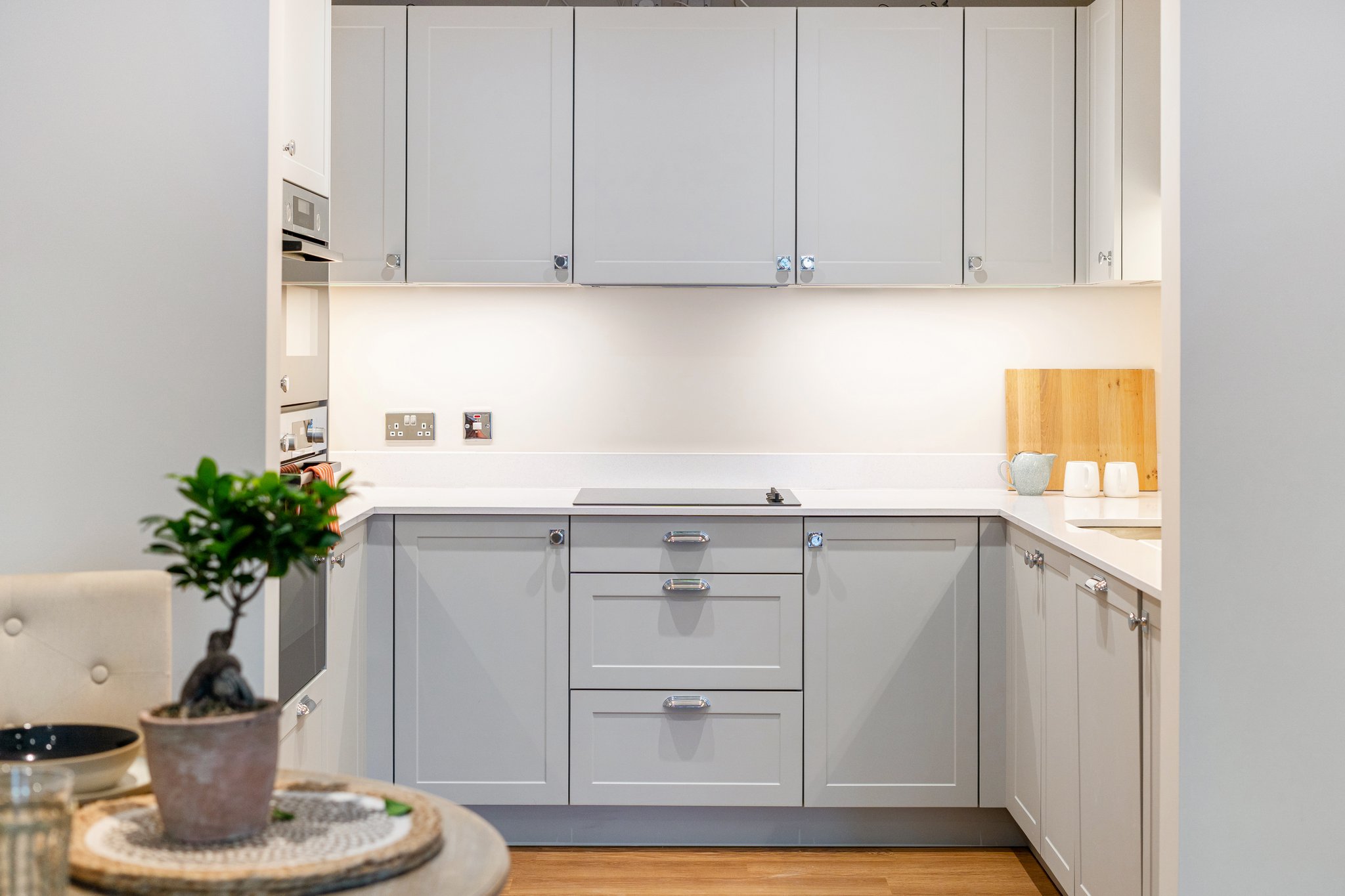 - Open plan kitchen dining room with bespoke range of shaker style cabinets, integrated appliances and Silestone worktops with access to the balcony