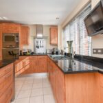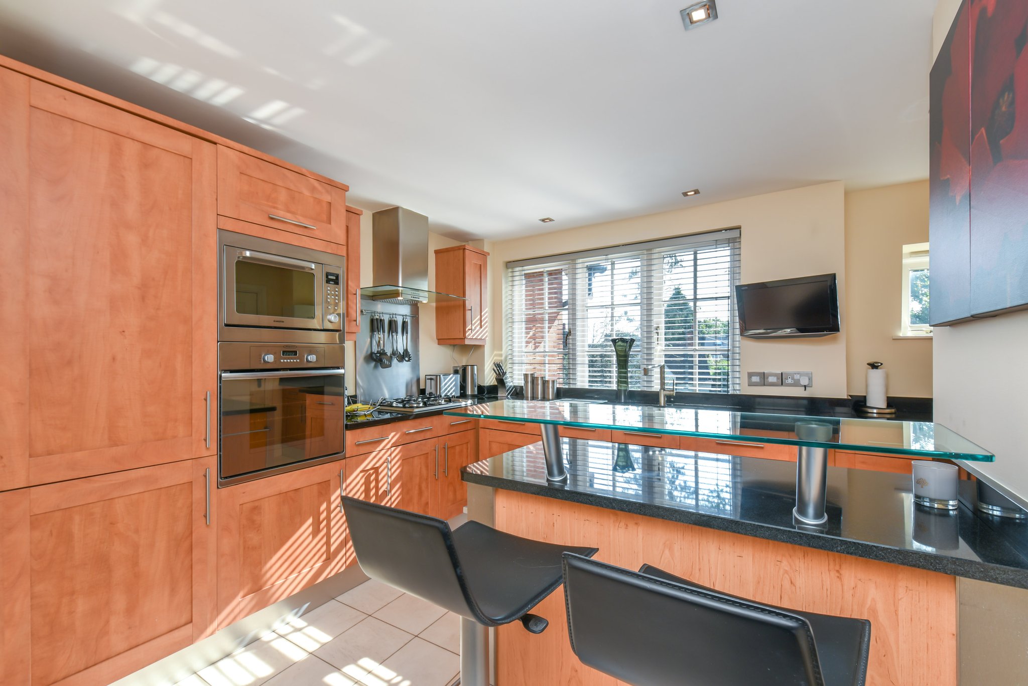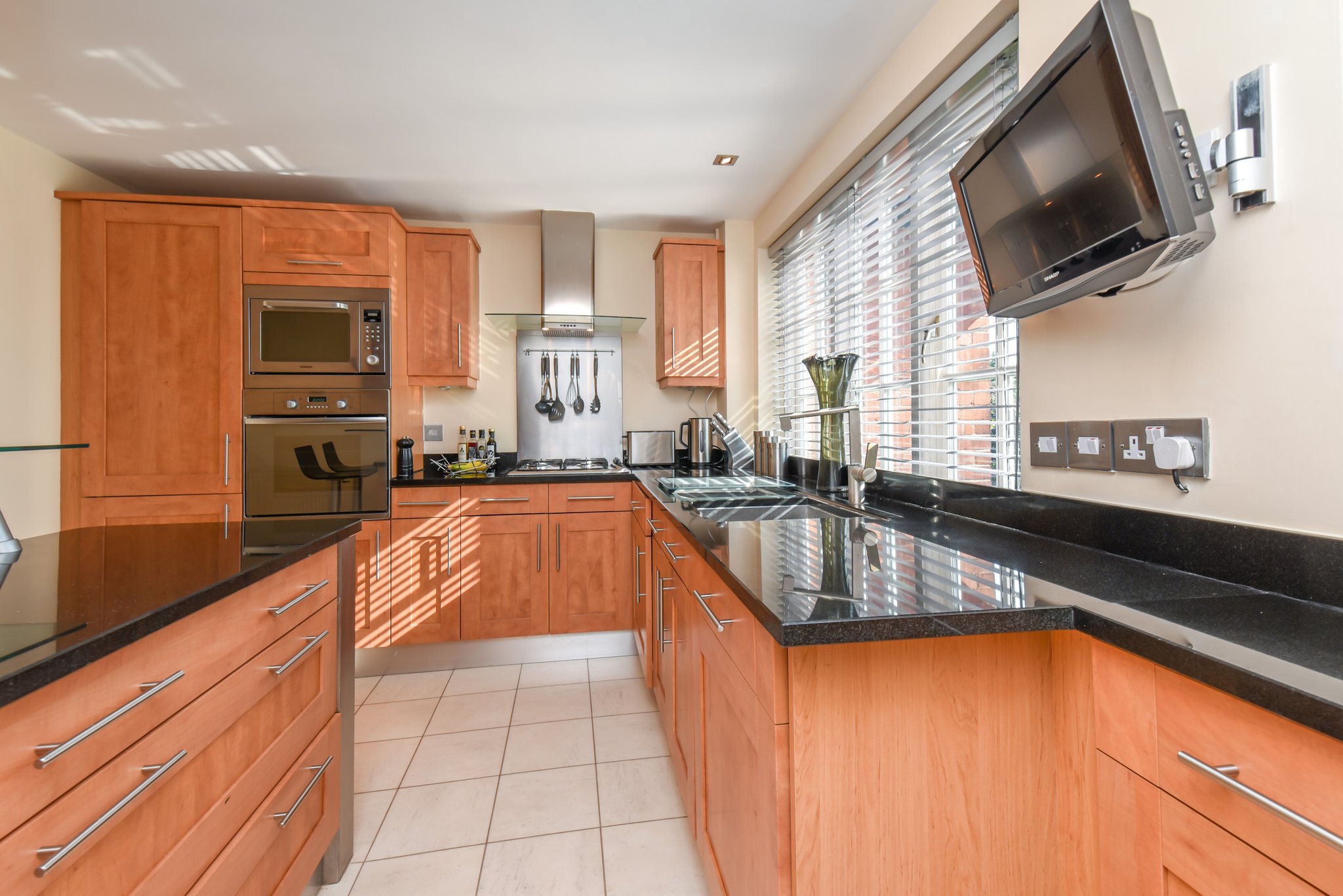 A stylish and modern fitted kitchen with wood effect eye and base level storage units and drawers with black granite work surfaces over, and Amtico flooring. Integrated appliances include washer dryer, Worcester Bosch boiler, gas hob with extractor over, microwave, and fridge freezer. A beautiful modern breakfast bar with architect-style drawers finishes off this well fitted and functional space.