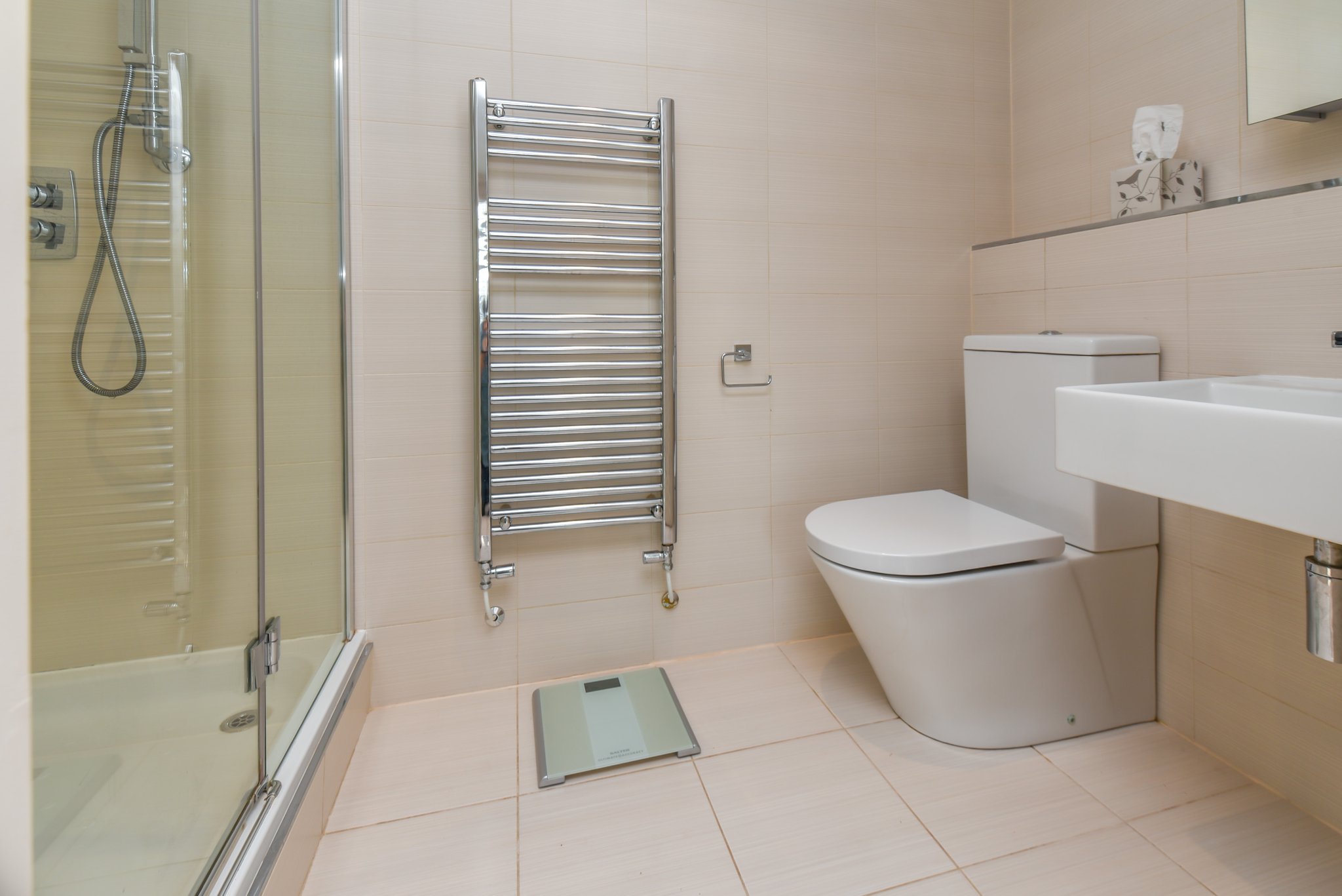 Fitted with a white Porcelanosa modern suite including low flush WC, wash basin, glass fronted bathroom cabinet, walk in shower cubicle.