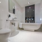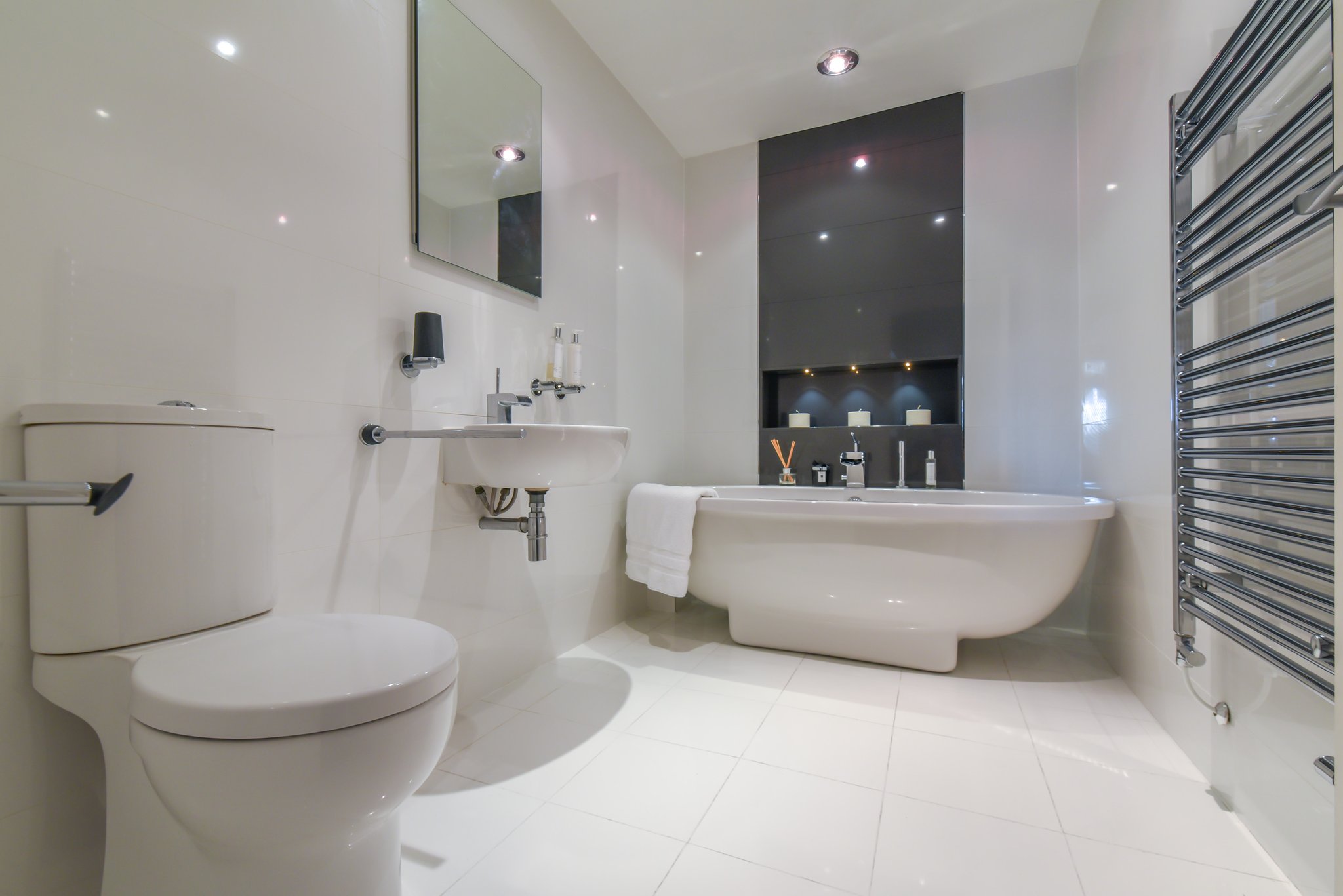 A beautifully fitted, luxurious and fully tiled bathroom comprising Porcelanosa sanitaryware has low flush WC, wash basin, built in cabinet with glass front, free standing bath.