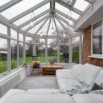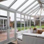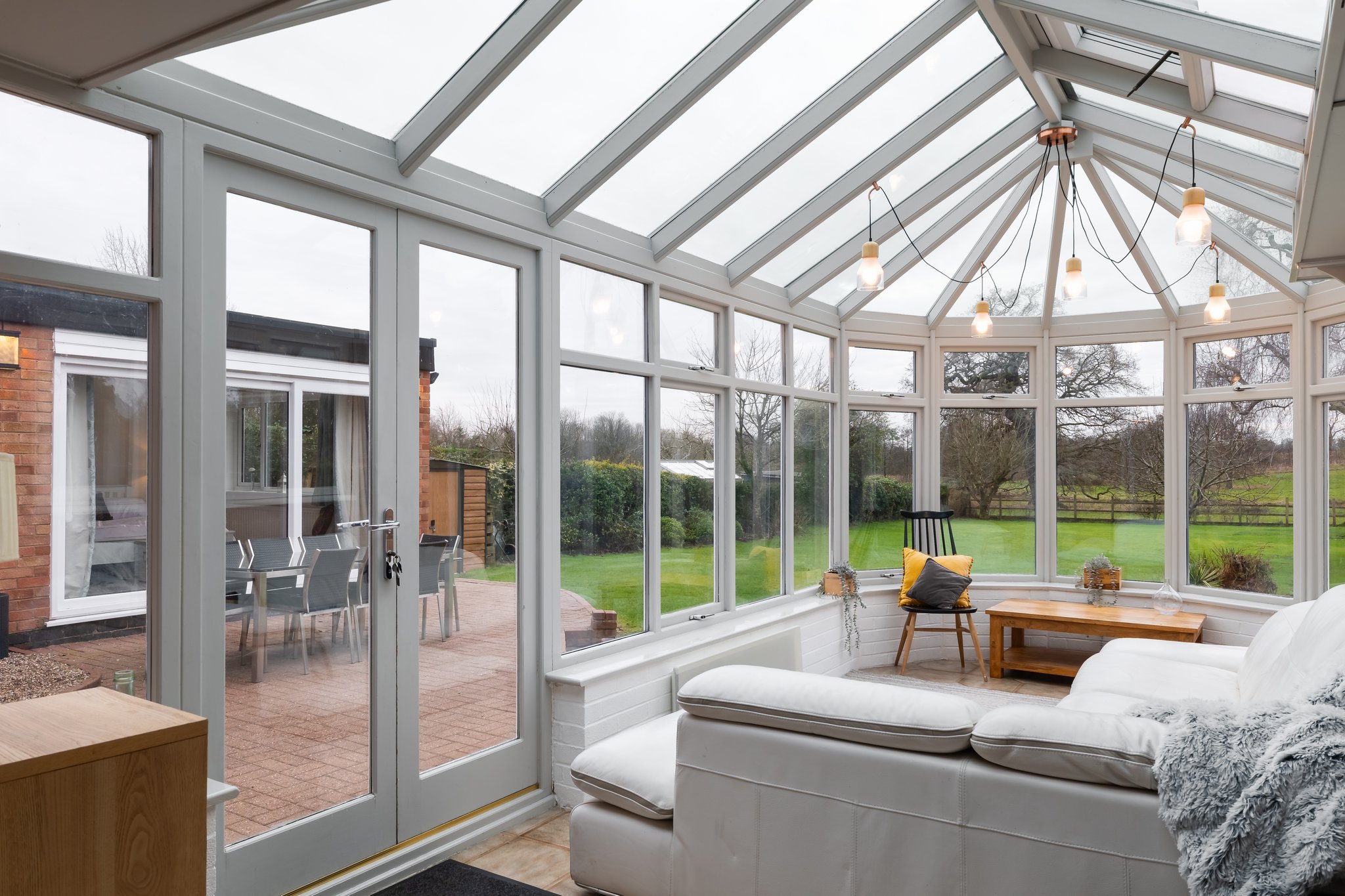 A well-proportioned conservatory with doors opening onto the garden terrace.