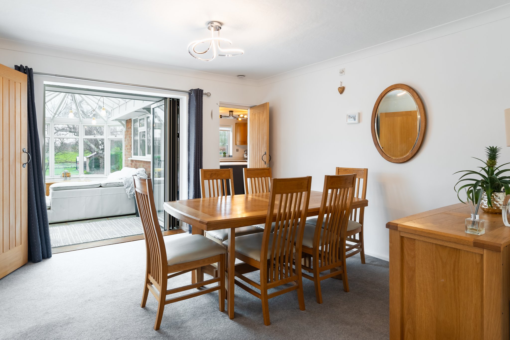 A spacious dining area conveniently located close to the kitchen, having bi-folding doors opening into the conservatory.