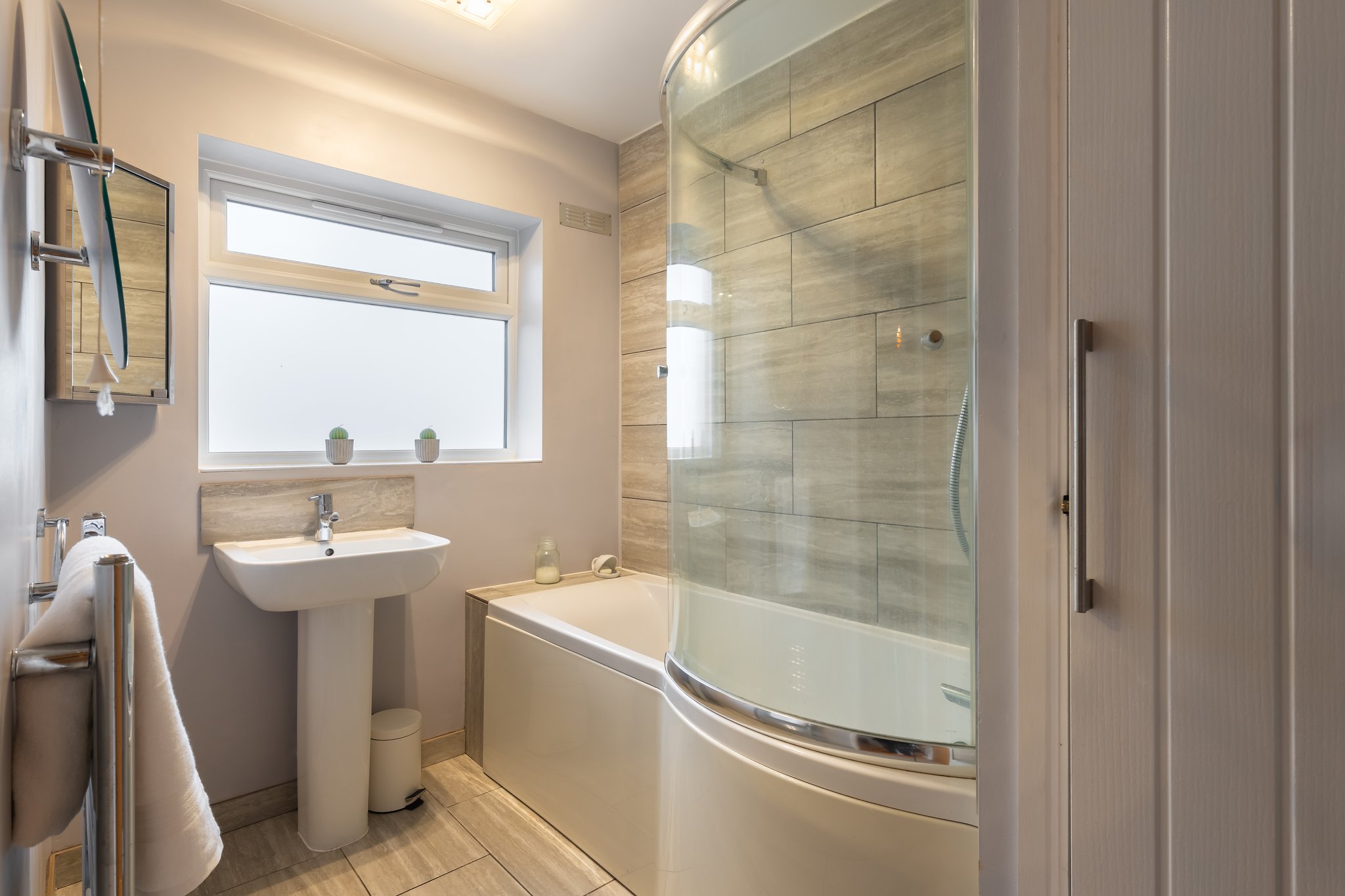 Fitted with a modern white suite comprising panelled bath with mains fed shower over, hand basin, tiling to splashback areas and floor, window to rear elevation, cupboard housing the water tank.