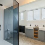 A beautifully fitted en suite with a large shower cubicle with mains fed shower over, low flush WC, bespoke his and hers hand basins inset into a vanity unit with storage, vinyl flooring and acrylic panelling, and a wide expanse of high level windows to the rear offering spectacular views.