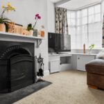 A beautiful, well-proportioned reception room with exposed beam, two bay windows to front elevation with storage beneath, feature cast iron fireplace with wooden mantle and open grate, and built-in shelving.