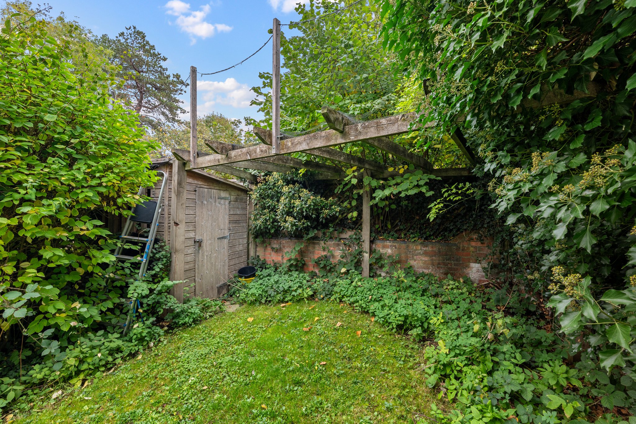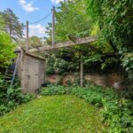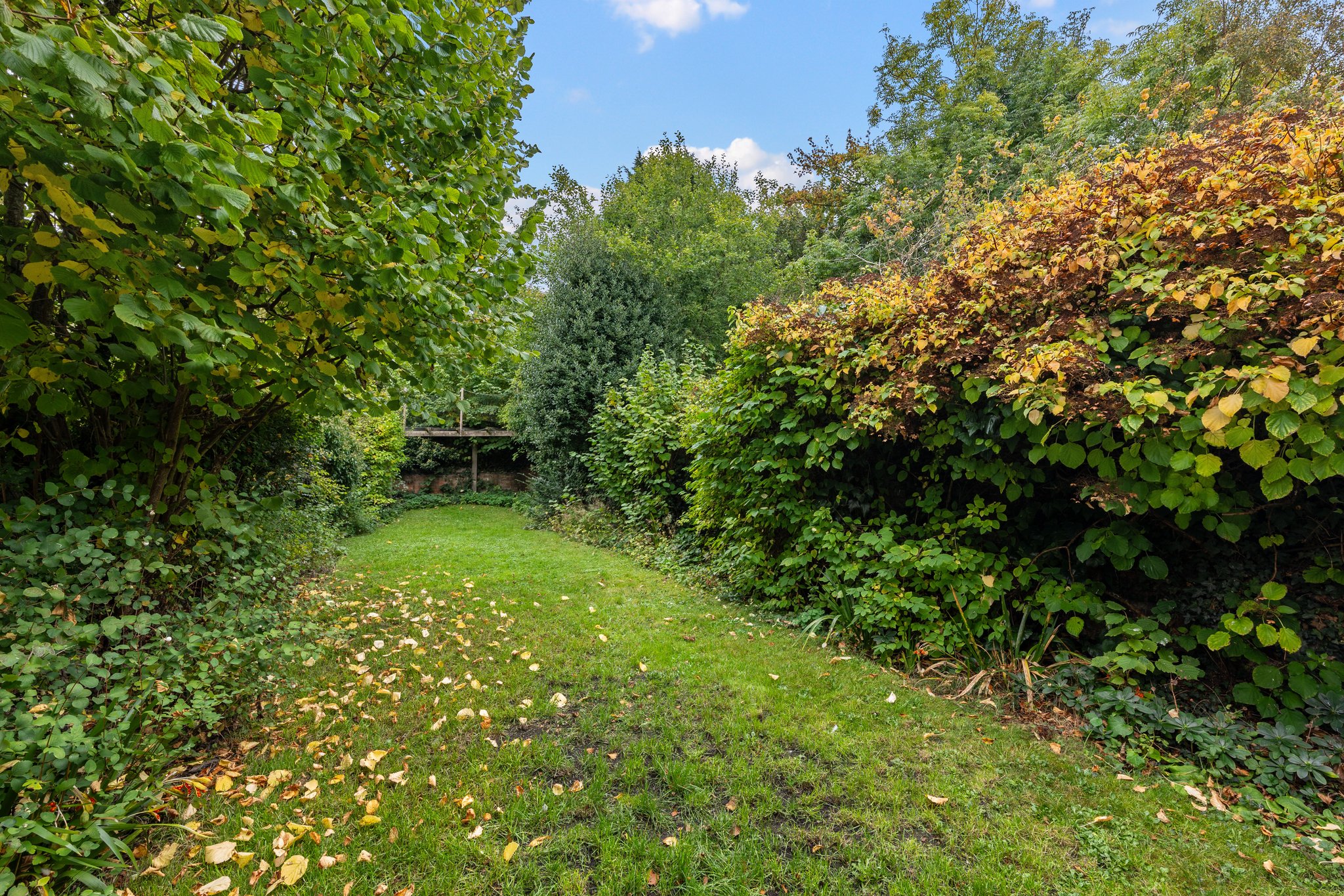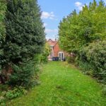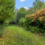 A private, East-facing rear garden, mainly laid to lawn with paved patio area and surrounded by mature trees and shrubs.
