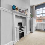 A second generous reception room ideal for formal dining and entertaining, with double glazed window overlooking the rear patio area, double glazed French doors also leading out into the rear garden, dado rail, feature Art Nouveau cast iron fireplace with ornate surround and charming inset tiling, door to:-