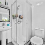 Fitted with a three piece suite comprising low level WC, pedestal wash basin, shower cubicle with mains fed shower, extractor fan, tiling to splashback areas and tiled floor. Window to rear elevation.