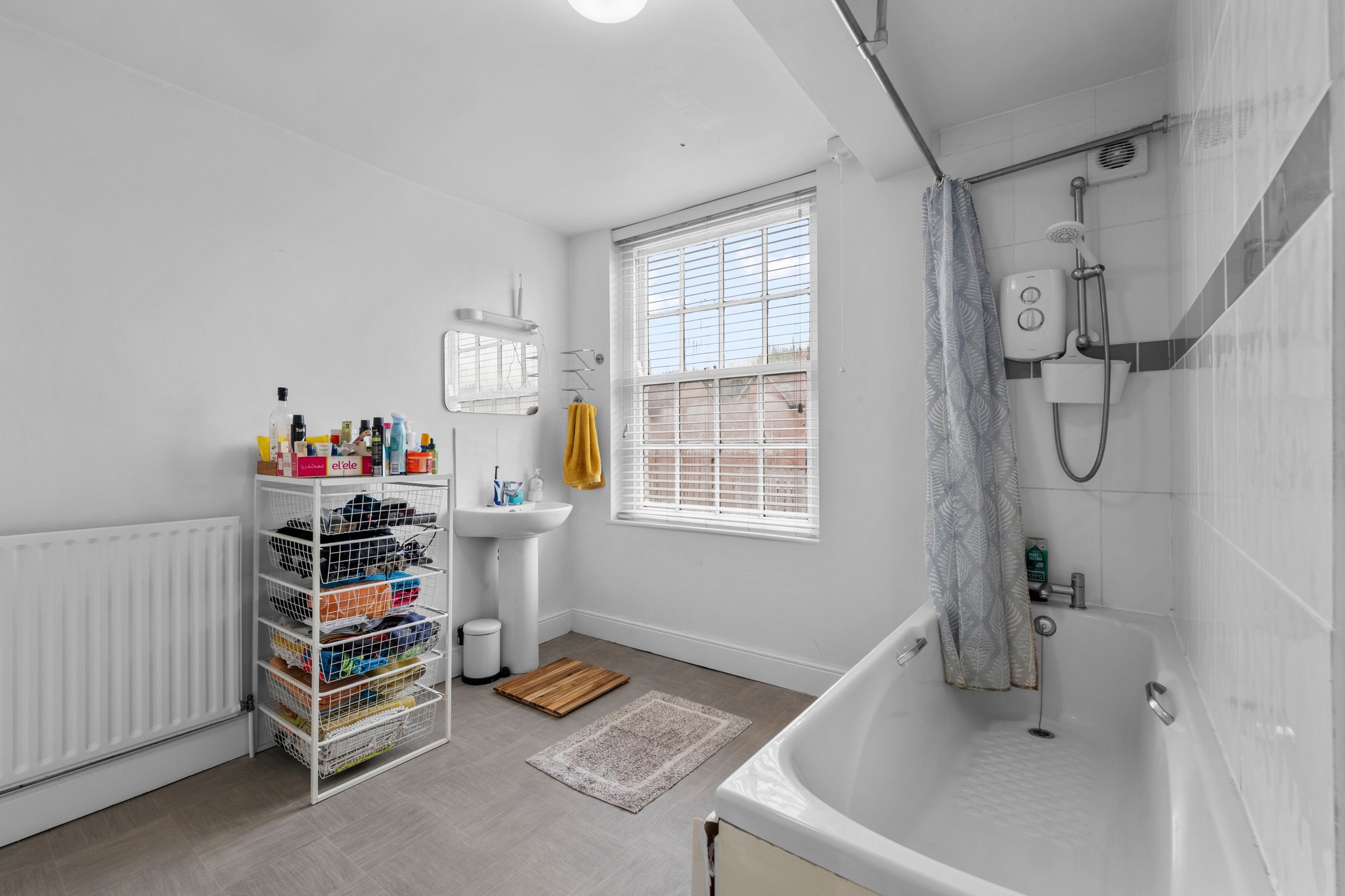 A spacious family bathroom comprising panelled bath with mixer tap and shower over, pedestal wash basin, linen store with shelving, extractor fan, tiling to splashback areas and tiled floor. Window to front elevation.