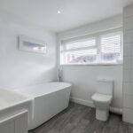 - Family bathroom with modern white suite with bath tub