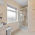 A bright, well appointed family shower room benefitting from tiling to full height, fitted with a vanity wash basin with storage beneath, low level WC, shower cubicle with mains fed shower, extractor fan and large built-in linen storage cupboard. Window to rear elevation.